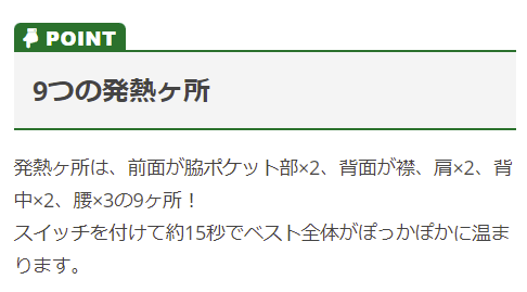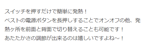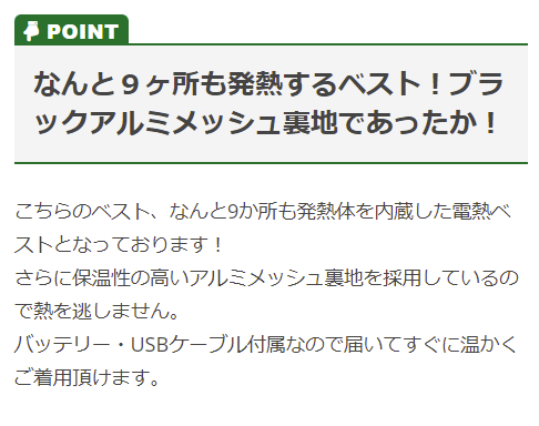 | 特徴 | 保温性の高い発熱体内蔵型電熱ベスト ブラックアルミメッシュ裏地+9ヶ所発熱で暖かく保温性抜群。 ・背ネーム ・反射プリント(後右肩) ・電源ボタン(左身頃内側) ・バッテリー収納ポケット ・USBケーブル(コネクタ) ・胸ポケットファスナー周りロゴ入り圧着プリント ・保温性の高いブラックアルミメッシュ裏地使用 ◆発熱ヶ所…前面:脇ポケット部(2ヶ所)背面:襟(1ヶ所)、肩(2ヶ所)、背中:(2ヶ所)、腰(3ヶ所)の9ヶ所が発熱し、約15秒でベスト全体が温まります。 ◆付属品…バッテリー・USBケーブル 【バッテリー】 電圧/容量:3.7V/10,000AH 定格電圧/定格容量:5V/6,100mAh 入力:5V 2A 出力:5V 2.2A[MAX]※ポート2個口 サイズ:縦134mm×横68mm×厚さ16mm 充電時間:約6時間(2Aアダプター使用時)※高速充電器には非対応 |