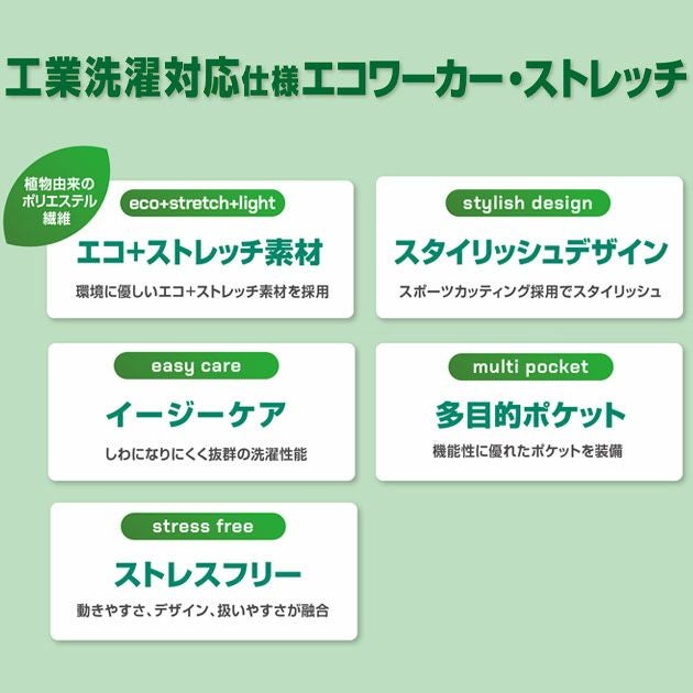 | 【特徴】 | タフでイージーケアな工業洗濯対応の作業着! しかもサトウキビ由来のエコなポリエステル繊維を採用! ストレスフリーなストレッチ作業着! ◆耐久性に優れ、工業洗濯に対応! 生地の堅牢性や耐久性を見直し、家庭での洗濯はもちろん、工業洗濯にも対応。 色落ちしにくく型崩れしにくい設計の作業着です! ◆エコな作業服!植物由来のCO2低減素材を採用! サトウキビ等を原料とする植物由来のエチレングリコールと通常の石油由来の素材をミックスした東レ「エコディア」を採用。 環境への負荷を低減させてくれます。 ◆バネのように伸びる!「ライトフィックス」 ポリエステルをバネのような形状に加工したライトフィックスを採用。 抜群のストレッチ性でストレスフリーな着心地を実現。 ストレッチバック性にも優れているので常に体の動きに追従し、型崩れしにくい素材です。 ◆修理の際の付け替えを容易にするためのファスナー後付け設計 ◆胸のポケットはスマホを収納できる内ポケット付き ◆手帳などを収納できるシンプルな胸ポケット ◆左胸ペン差し ◆名札を装着できるループを搭載 ◆左袖ペン差し ◆エコマーク認定番号:22103002 ◆カーボンフットプリント(CFP):11.526㎏-CO2 |