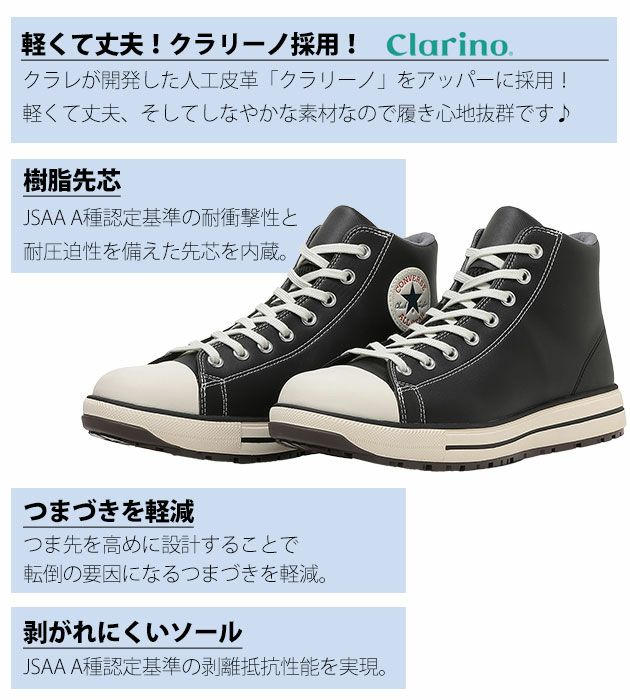 | 【特徴】 | 大人気コンバース安全靴! 更なるスペックアップデートを遂げたハイカットモデル登場! ヒールラベルやラインの入ったミッドソールなど、よりオールスターらしいデザインに。 シックなブラックモノクロームとオールスターらしい王道のブラック、さらにカジュアルなナチュラルホワイトの3色! カジュアルな見た目と抜群な履き心地を両立したハイスペック安全靴! ◆軽くて丈夫な人工皮革「クラリーノ」を採用! ◆クッション性のあるミッドソールと中敷きで疲れにくい! ◆つま先を少し高めに上げる設計をしているのでつまづきにくい! ◆靴の中は抗菌防臭加工を施しているのでニオイを軽減! ◆ソールは耐滑性を備え、動きやすさと安全性を確保 ◆ベロ部分は作業時のムレを逃がすメッシュ素材を採用!さらに網目状の通気孔を設け、ムレを軽減! ◆かかと部分に反射材を採用!オールスターらしいデザインを生かしながら視認性も確保 |