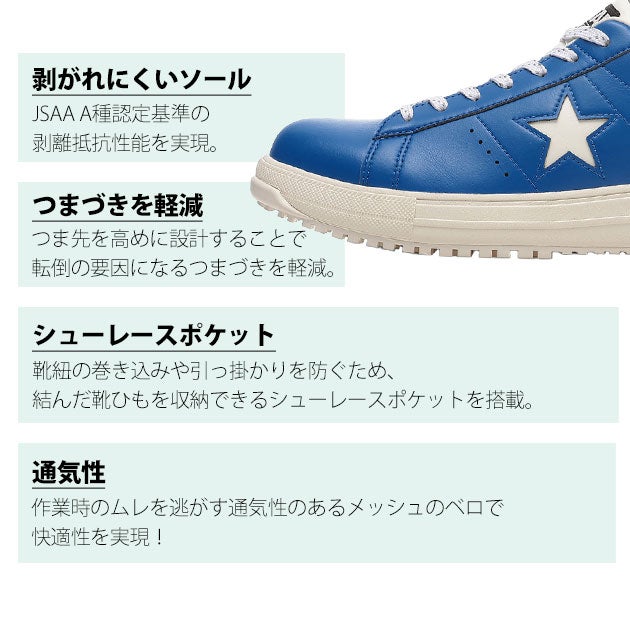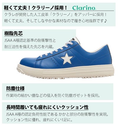 | 【特徴】 | 2026年限定モデルは「ブルー」! 今しか手に入らないカラーを楽しもう! 1974年に誕生したCONVERSEを代表するアイコンの一つ「ONE STAR」。 「70年代の幻」とも称されたレザーバスケットボールシューズのデザインを安全靴に! ◆軽くて丈夫な人工皮革「クラリーノ」を採用! ◆つま先を少し高めに上げる設計をしているのでつまづきにくい! ◆ソール剥がれにも強い!JSAA規格適合の剥離抵抗性能を備えたアッパーとソールの接着強度を実現! ◆細かい塵などの侵入を防ぐ防塵ガセットタンを採用! ◆結んだ靴ひもを収納できるシューレースポケットを搭載! ◆アッパーやインソールには抗菌・防臭加工を施し、清潔さを保ちます! ◆かかと部分に反射材を採用!コンバースらしいデザインを生かしながら視認性も確保! ◆かかと部の耐衝撃性を備えたソールとインソールでクッション性抜群!疲れにくい! ◆作業時のムレを逃がす通気性のあるWメッシュ素材のタンを採用! ◆耐滑性と屈曲性に優れたソールで作業時のストレスを軽減! |