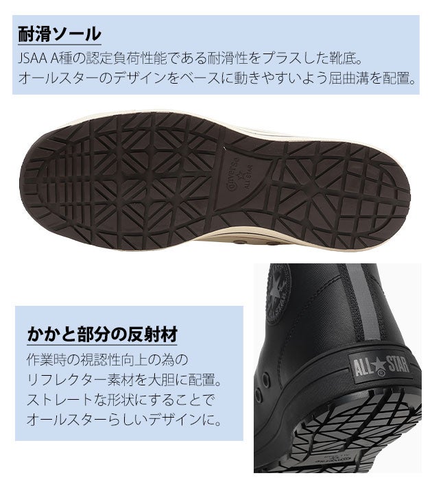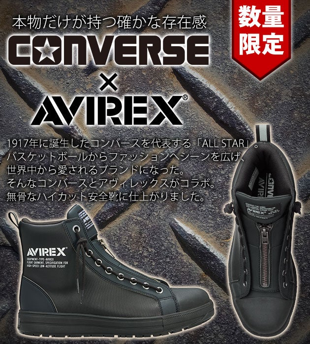 | 【特徴】 | 無骨なデザイン。 コンバースがアヴィレックスとコラボ。 ミリタリーテイストあふれるハイカット安全靴が登場! 更なるスペックアップデートを遂げたハイカットモデル登場! 無骨な見た目と抜群の履き心地を両立したハイスペック安全靴! 数量限定です!手に入れるなら今しかない! ◆甲部分には特徴的なセンタージップを採用! ◆軽くて丈夫な人工皮革「クラリーノ」を採用! ◆クッション性のあるミッドソールと中敷きで疲れにくい! ◆つま先を少し高めに上げる設計をしているのでつまづきにくい! ◆靴の中は抗菌防臭加工を施しているのでニオイを軽減! ◆ソールは耐滑性を備え、動きやすさと安全性を確保 ◆ベロ部分は作業時のムレを逃がすメッシュ素材を採用!さらに網目状の通気孔を設け、ムレを軽減! ◆かかと部分に反射材を採用!オールスターらしいデザインを生かしながら視認性も確保 |