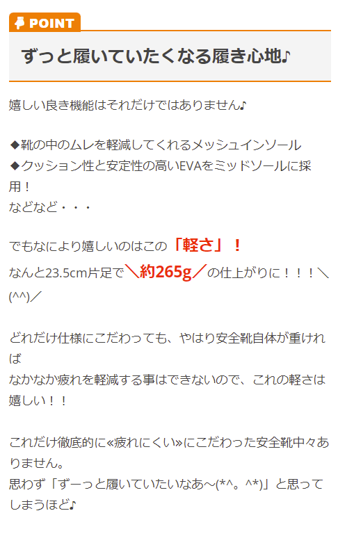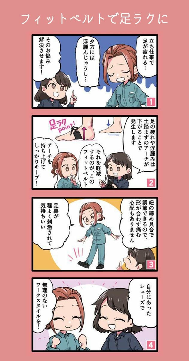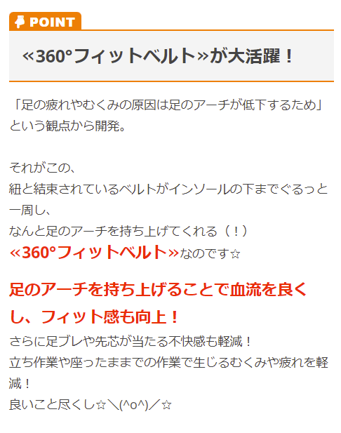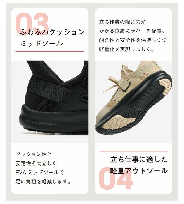 | 特徴 | 試し履きした90%以上の女性ワーカーがはきやすさを実感! 女性ワーカーの声を集めて作り上げた疲れにくい安全靴がついに登場! 先芯があることを感じさせないようなおしゃれなデザインです。 既存のセーフティーシューズを女性サイズにするだけでは女性用とは言えないのではないか… 働く女性にとって本当に欲しい靴はどのようなものか… 女性ワーカーの声をもとに設計。さらに試し履きなどの検証を重ね、本当に女性に必要な安全靴を見直しました! ◆足のむくみ疲れを軽減する360度フィットベルト! 足の疲れやむくみの原因は足のアーチが低下するから。 インソール下からベルトが一周し、足のアーチを持ち上げることで血流を良くし、ポンプ機能の補助やフィット感の向上を実現します。 さらに足ブレや先芯が当たる不快感も軽減され、長時間の立ち作業や座ったままでの仕事で生じるむくみや疲れを軽減します! ◆気軽に履けるカジュアルなデザイン! 仕事以外の時でもそのまま履いていける安全靴を目指しました。 ◆抗菌防臭通気インソール搭載 ◆履きやすいかかとの形状でサッと履ける! ◆クッション性と安定性を両立したふわふわクッションソール ◆立ち仕事に適した軽量アウトソール |