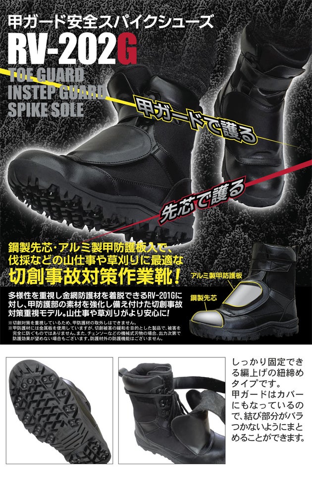 | 【特徴】 | 鋼製先芯・アルミ製甲防護板入で、伐採などの山仕事や草刈りに最適な切創事故対策作業靴! 多様性を重視し金網防護材を着脱できるRV-201Gに対し、甲防護部の素材を強化し備え付けた切創事故対策重視モデル。 山仕事や草刈りがより安心に! ※切創対策を重視しているため、甲防護材の取外しはできません。 ※甲防護材には金属板を使用していますが、切創被害の緩和を目的とした製品で、被害を完全に防ぐものではありません。 また、チェンソーなどの機械式刃物の場合、出力次第で防護効果が望めない場合もございます。 防護材外の防護機能はございません。 ◆しっかり固定できる編上げの紐締めタイプです。 ◆甲ガードはカバーにもなっているので、結び部分がバラつかないようにまとめることができます。 ◆透湿耐水構造(完全防水ではありません) |