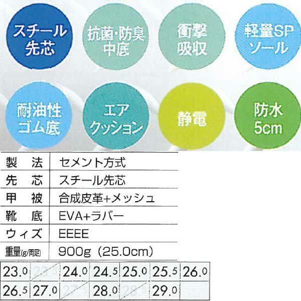 | 特徴 | 1、スチール先芯 2、抗菌・防臭中底 3、衝撃吸収 4、軽量SPソール 5、耐油性ゴム底 6、エアクッション 7、静電 8、防水5cm 9、かかと 10、AIRタンク 11、靴底の色は全色共通 |