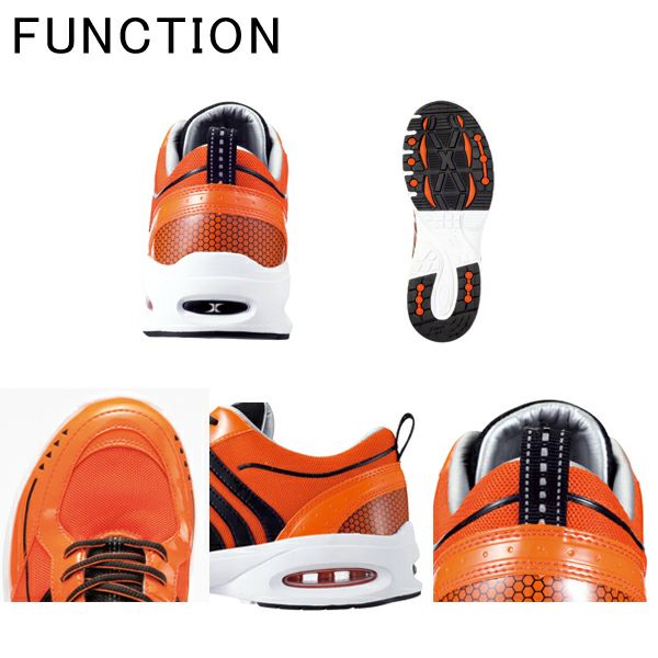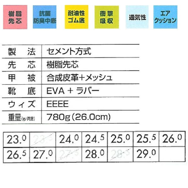 | 特徴 | 1、樹脂先芯 2、抗菌・防臭中底 3、衝撃吸収 4、耐油性ゴム底 5、通気性 6、エアクッション 7、AIRタンク 8、通気性の良いメッシュ素材。 9、かかと反射材を使用 10、オリジナルラバーソール 11、靴底の色は全色共通 |