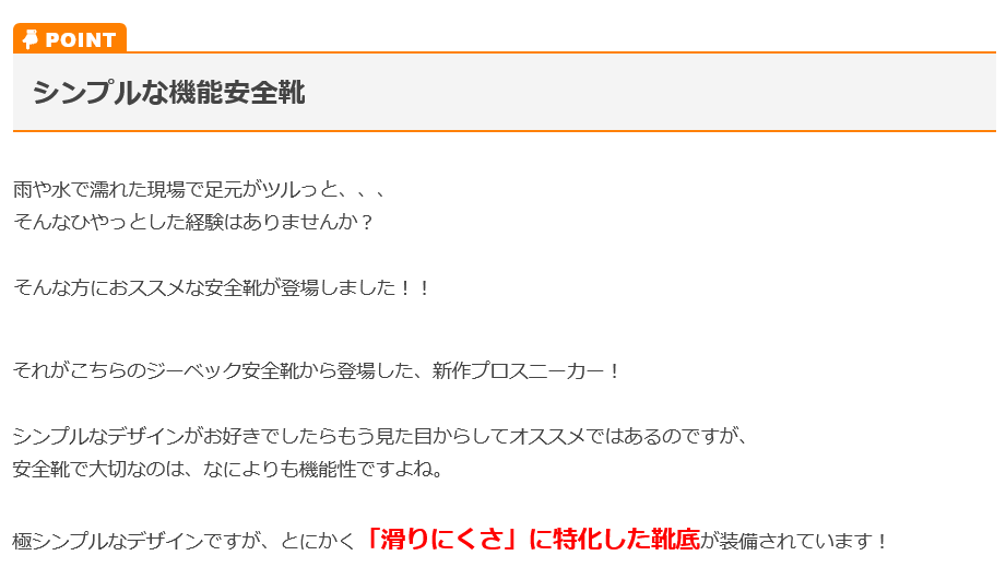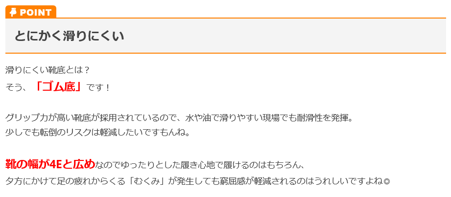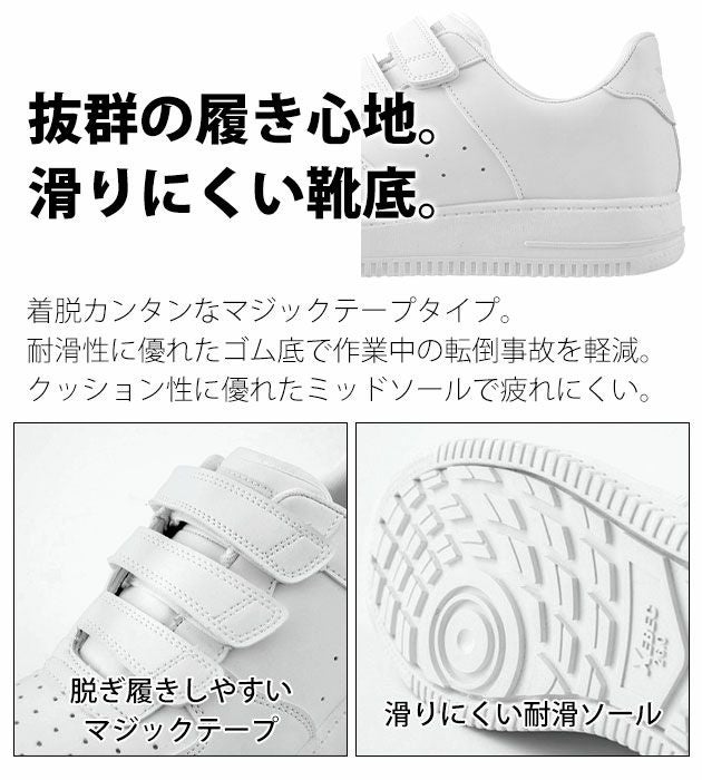 | 【特徴】 | 抜群の履き心地。滑りにくいソール。 耐滑性に優れたゴム配合のソールで作業中の転倒事故を軽減! ◆着脱カンタンなマジックテープタイプ ◆幅広4Eゆったり設計 ◆水や油で滑りやすい職場での転倒を軽減する耐滑ソール ◆クッション性に優れたミッドソール ◆ムレ防止構造インソール ◆22.0cmから30.0cmまでの幅広いサイズ展開で男女問わず履くことができます! ◆抗菌防臭インソールを採用 |