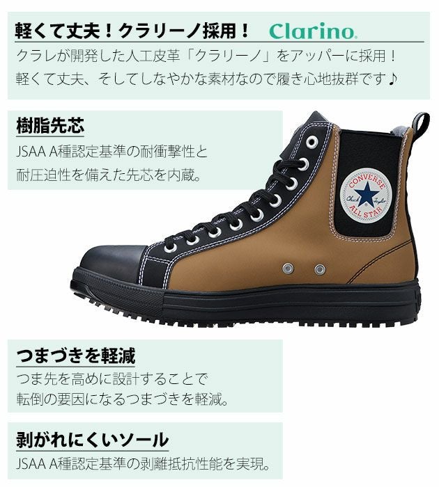 | 【特徴】 | しっかりフィットするサイドゴアのコンバース安全靴! コンバースの限定モデルにおしゃれなコヨーテ×ブラックがラインナップ! ◆軽くて丈夫な人工皮革「クラリーノ」を採用! ◆サイドゴア仕様だからしっかりフィット! ◆クッション性のあるミッドソールと中敷きで疲れにくい! ◆つま先を少し高めに上げる設計をしているのでつまづきにくい! ◆靴の中は抗菌防臭加工を施しているのでニオイを軽減! ◆ソールは耐滑性を備え、動きやすさと安全性を確保 ◆ベロ部分は作業時のムレを逃がすメッシュ素材を採用!さらに網目状の通気孔を設け、ムレを軽減! ◆かかと部分に反射材を採用!オールスターらしいデザインを生かしながら視認性も確保 |
