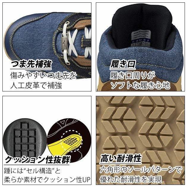 | 【特徴】 | 足を入れた瞬間、とりこになる履き心地のワークシューズに。 高品質な岡山県産デニムを贅沢に使用した数量限定モデル。 ミズノのスポーツテクノロジーがワークシューズを進化させた。 軽さ+優れたクッション性で、快適な履き心地を実現。 国産デニム発祥の地「岡山」のデニムをふんだんに使用した高級感あふれるおしゃれ安全靴! 二度と手に入らない限定モデルです! ◆ランニングシューズにも採用されてい柔らかいミッドソールで疲れにくい! ◆クッション性が高く耐油・耐滑性に優れたソールを採用! ◆つま先には硬質樹脂先芯を採用し、軽くて強い安全靴に仕上げました! ◆さらにつま先は耐久性のある人工皮革で補強! ◆夜間作業時に光を反射する再帰反射材をサイドに採用 ◆スリップサイン搭載で買い替え目安が分かる! ◆サイドにはメッシュを採用し通気性をプラス! |