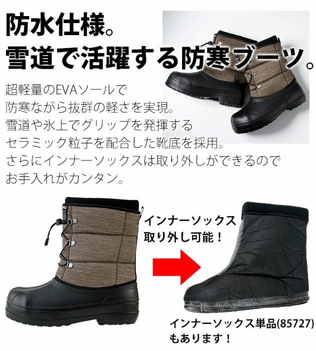 | 【特徴】 | 防水仕様の防寒ブーツ! 超軽量のEVAソールとグリップ力抜群なセラミック粒子配合のソールで冬を快適に! 防水仕様のインナーソックスは取り外し可能なのでお手入れもらくちん! ◆防水性と保温性が抜群に良いインナーソックス採用 ◆入れ替え用にインナーソックス単品(85727)も発売中! ◆雪道や氷上でグリップを発揮!セラミック粒子配合ソール ◆片足430gの超軽量モデル! |
