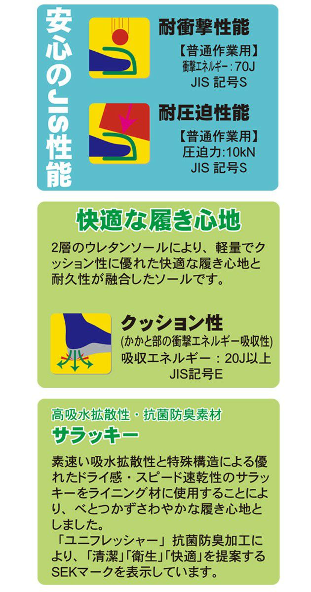 | 特徴 | 足にピッタリフィット! 軽いフットワークで疲れ知らず。 ・発泡ポリウレタン2層構造により、軽量でクッション性に優れた安全靴です。 ・甲革に、しなやかで足にフィットしやすい本牛革を使用。丈夫で長持ち! ・裏材には、“高吸水拡散性・抗菌防臭”素材“サラッキー”を使用し、べとつかずさわやかな履き心地です。 |
