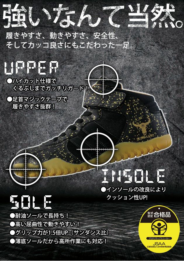 | 特徴 | 強いなんて当然。 履きやすさ、動きやすさ、安全性。そして、カッコよさにもこだわった1足。 ■ハイカットタイプだからくるぶしまでガッチリガード! ■足首マジックテープで履きやすさバツグン! ■インソールの改良によりクッション性UP! ■耐油ソール・高い屈曲性で機能面もバッチリ! ■グリップ力が1.5倍UP!(サンダンス製品比) ■薄底ソールで高所作業にも対応! |