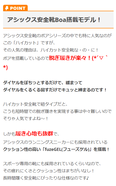 | 特徴 | アシックスからダイヤルタイプ安全靴登場! Boaシステムを採用し、フィット性を高めたハイカットタイプ! ■ランニングシューズにも採用されているクッション素材「fuzeGEL(フューズゲル)」を採用! スポーツシーンで採用されたソールだから、疲れにくい! ■アシックスオリジナルの耐油性ラバーCPソール仕様 |