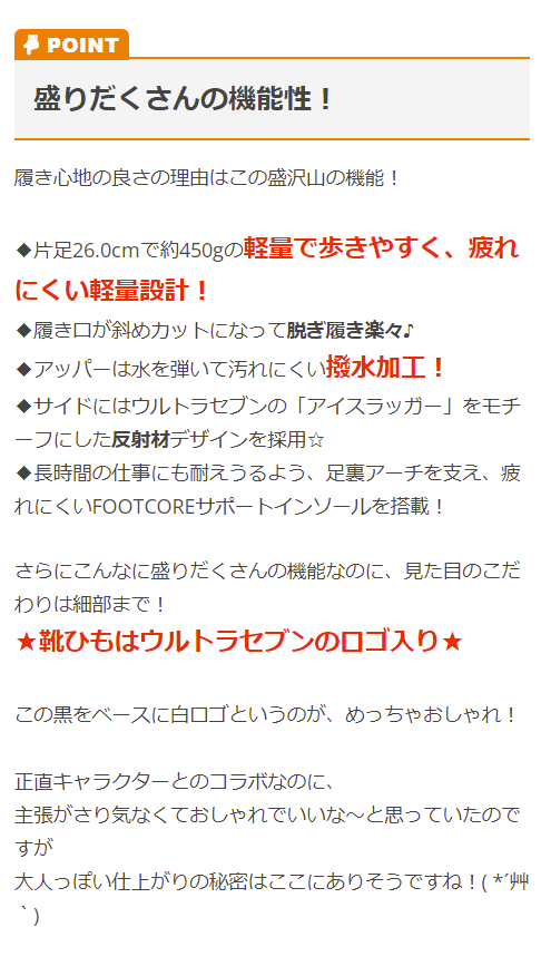 | 特徴 | ウルトラマンの強さと、安心感を。 力強く、安心の象徴でもある「ウルトラマンと、あらゆる現場・環境に適した商品を生み出す「弘進ゴム」がコラボ! 高機能な「ULTRAMAN」シリーズは弘進ゴムの技術でウルトラマンの世界観を再現した新しい安全靴です。 ◆ウルトラセブンの「アイスラッガー」をモチーフにした反射材デザイン ◆足裏アーチを支え、疲れにくいFOOTCOREサポートインソールを使用 ◆足のブレを抑える甲の低い足型と幅広3E設計。 ◆靴ひもはウルトラセブンのロゴを使用 |