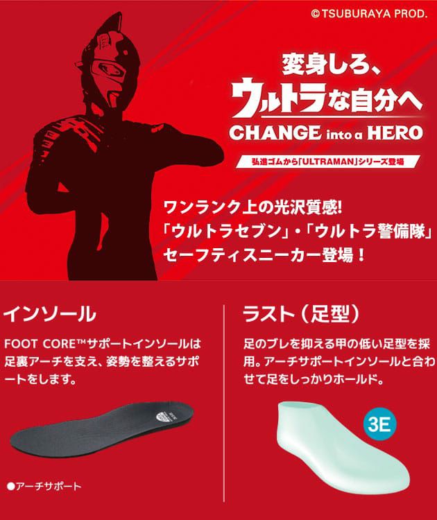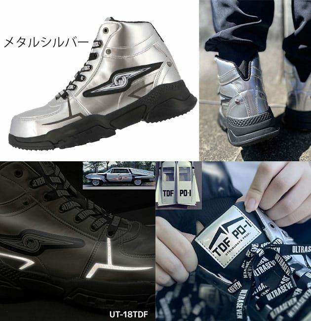 | 特徴 | ワンランク上のウルトラな光沢質感! 「ウルトラ警備隊」「ウルトラセブン」セーフティスニーカー! ◆ウルトラセブン劇中内「ウルトラ警備隊」と「ウルトラセブン」モデルの先芯を備えた、光沢質感のセーフティスニーカー! ◆ワークシーンのみならず、普段の生活でも映えるスタイリッシュなカジュアルデザイン。 ◆歩きやすくて疲れにくい、軽量設計! ◆作業中や移動中の障害から、足先を保護する樹脂先芯入り。 ◆足首まで保護するミドルカット仕様、斜めの履口で脱ぎ履きも簡単。 ◆アクセントのサイドマークは「ウルトラ警備隊 エンブレム」と「アイスラッガー」をモチーフに。 ◆サイドプリント2か所は反射仕様。 ◆履き心地と姿勢サポートを重視した「FOOT CORE」インソール搭載。 ◆正面にウルトラ警備隊特殊車両「TDF PO-01ポインター」イメージのワッペン。 ◆靴紐にはウルトラセブンのロゴをプリント。 |
