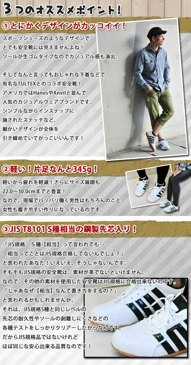 着用サイズ:26.5cm 靴下を履いた状態で履いてみましたが本当にぴったりでした。 冬場に厚手の靴下を履いたり、インソールを入れたりするとキツいかも。 ワンサイズ上を選んだ方が無難かもしれません。 軽くて本当に安全靴?と疑ってしまいました。 よくある厚過ぎるソールじゃないので転倒もしづらそうです。 黒を履きましたが、これはカッコイイですね。 ちょっとアディダスのスポーツスニーカーっぽいかも。 |