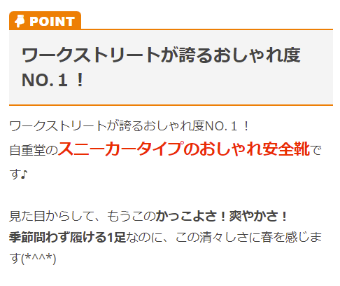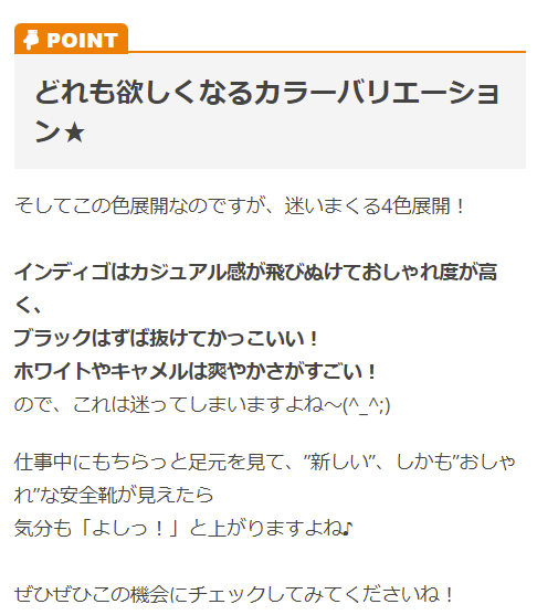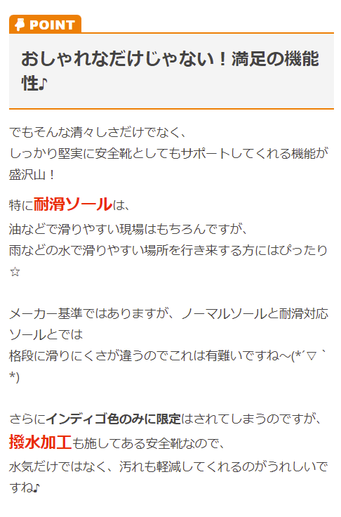 | 特徴 | JSAA B種適合!スタイリッシュで履きやすい! カジュアル感覚で履きこなせるローカット安全靴! 水や油に強い耐滑ソールで安全!(※耐滑性能はメーカー基準) インディゴのみ撥水加工! |