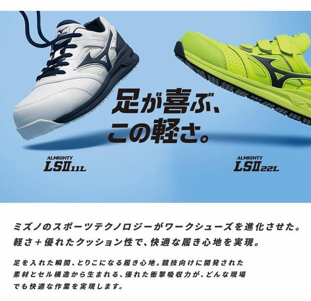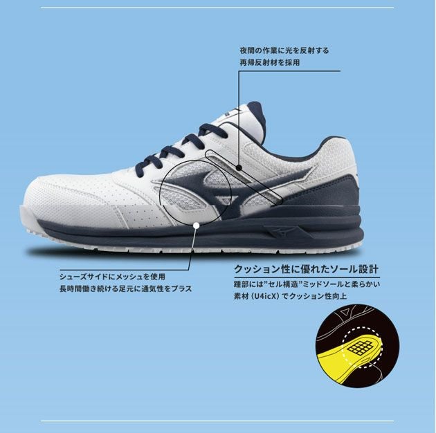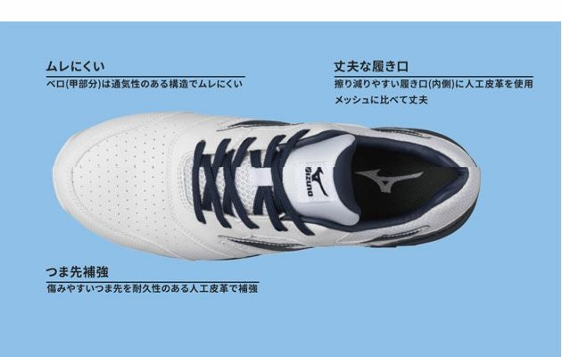 | 特徴 | スポーツテクノロジーを研究するミズノだからこそできた安全靴! 現場で働き続ける足元をしっかり支えます! ◆ランニングシューズにも採用されてい柔らかいミッドソールで疲れにくい! ◆履いた瞬間に感じる「軽さ」! ◆クッション性が高く耐油・耐滑性に優れたソールを採用! ◆すり減りやすい履き口の内側は人工皮革で補強! ◆つま先には硬質樹脂先芯を採用し、軽くて強い安全靴に仕上げました! ◆さらにつま先は耐久性のある人工皮革で補強! ◆夜間作業時に光を反射する再帰反射材をサイドに採用 ◆スリップサイン搭載で買い替え目安が分かる! ◆サイドにはメッシュを採用し通気性をプラス! ◆ご注意◆ この商品は色によってサイズ展開が異なります ・ライトグレー×ホワイト…22.0~28.0、29.0、30.0cm ・ネイビー×イエロー、イエロー×ダークグレー…24.5cm~28.0、29.0cm |
