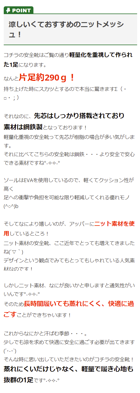以前、鉄板の入ったものを履いており、重たかったので余計かもしれませんが、軽いです。 見た感じも、某有名メーカーのシューズ?と一瞬思うくらいスニーカーに見えます。 まだ履き始めたところなので、耐久性がどうかな?くらいでしょうか。