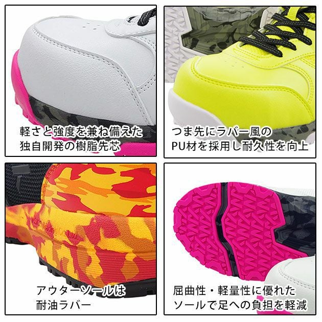 | 特徴 | カモフラージュ柄で魅せるシューレースタイプ ◆3E相当のラスト採用 ◆屈曲性・軽量性に配慮したソール設計で足への負担を軽減 ◆足裏のアーチに沿うように設計されたインナーソールで足裏からくる疲れに対処 ◆インナーソールつま先裏にニオイを消臭する繊維MOFFを仕様 ◆夜間の視認性を向上させる反射材を使用することで安全面に配慮 ◆先芯は軽さと強度を兼ね備えた独自構造 ◆スリップサイン搭載でソールの摩耗を確認可能 ◆一番摩耗しやすいつま先にラバー風のPU材を採用し耐久性を向上 ◆アウターソールは耐油ラバー |