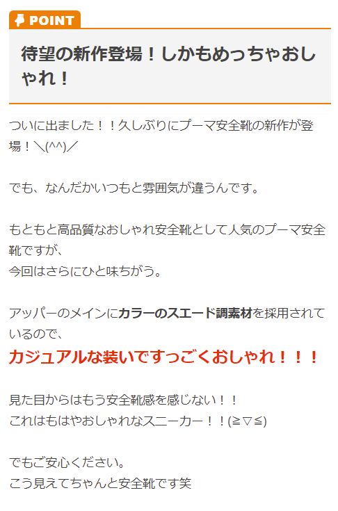 | 特徴 | スタイルを選ばない新しいプーマ安全靴、登場! プーマらしいカラーと性別を問わず履ける豊富なサイズ展開。 スエード調のカジュアルデザインでワークやアウトドアからプライベートまで 様々なシーンで履けるプーマの新しい安全靴。 ☆グラスファイバートゥーキャップ グラスファイバーで強化した新開発の合成樹脂先芯 一般的なスチール先芯より軽く、帯磁性と断熱性を兼ね備えている ☆アーチサポートインソール 土踏まず部分をサポートするフィット感抜群のアーチサポート設計 ☆新開発アウトソール 独自の溝パターンが靴全体の柔軟性を高め、作業環境下やウェットな状況下で効力を発揮 ☆静電気帯電防止 人体に帯電した静電気を靴底から逃がす ☆衝撃吸収 かかとへの負担を減少させ、長時間履いていても疲れにくい ☆豊富なカラーとサイズ展開 ワーク・アウトドア・プライベート、様々なシーンで性別を問わず足元を彩るアイテム 自分色で楽しもう! |