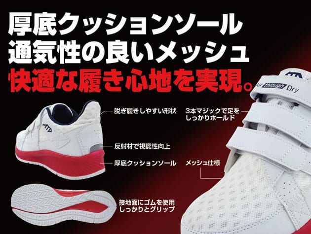 | 特徴 | メッシュ素材で足元快適! 長時間履いても疲れにくいローカット安全靴! マジックテープタイプだから脱ぎ履きらくらく! ◆制菌・消臭インソール搭載 制菌消臭加工されたインソールで靴の中を清潔に保ちます! ◆接地面ゴム底 ◆通気性の良いメッシュ素材 ◆足への負担を和らげるクッション性のある厚底ソール ◆つかみやすく引き上げやすい踵形状で履きやすい ◆かかと反射材 |