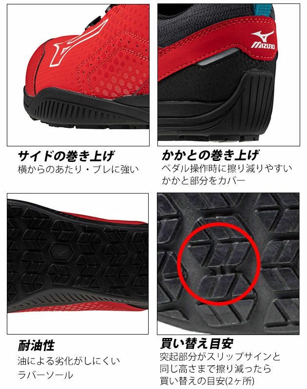 | 【特徴】 | クッション性と素足感覚を両立! ミズノだからこそできたスポーツ科学の力を安全靴に惜しみなく投入! ◆ミズノ史上最高の高反発ソール素材「ミズノエナジー」採用! ミズノがスポーツメーカーとして培ってきた「反発力」。それがミズノエナジー! 踵部に配置することで着地する時のクッション性をアップさせ、疲れにくい安全靴を実現しています。 ◆カチカチ締めるだけ!しっかりフィットするBOA L6ダイヤルシステムを採用! 優れた耐久性とパワーのあるプッシュ式ダイヤルでしっかりフィットさせることができます。 予期せぬ誤開放の発生リスクを抑えたプロ向けのダイヤルです! 押し込んで回して締めるだけ、引き上げるだけで簡単に緩められます! ◆横からの衝撃を抑えるサイドの巻き上げソール ◆運転のペダル操作時にすり減りやすい踵部分を巻き上げるように設計 ◆かかと部分にはすり減りにくいラバーを採用 ◆油による劣化がしにくいラバーソール ◆すり減りやすい履き口に人工皮革を使用 ◆傷みやすいつま先を耐久性のある人工皮革で補強 ◆かかと部分には反射材を採用 ◆前足部のソールを薄くすることで素足感覚を実現 ◆突起部分がソールのスリップサインと同じ高さまですり減ったら買い替えの目安 |