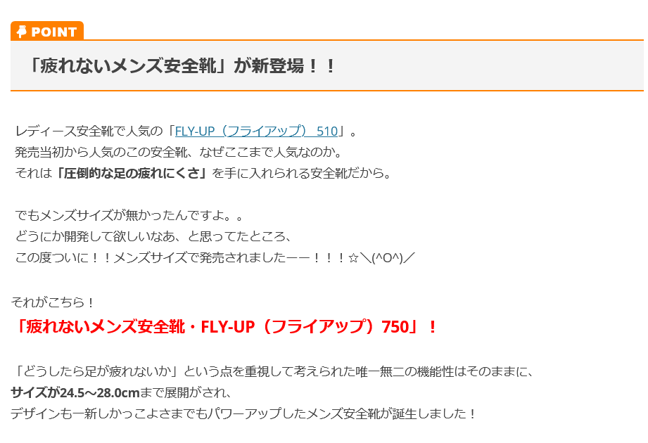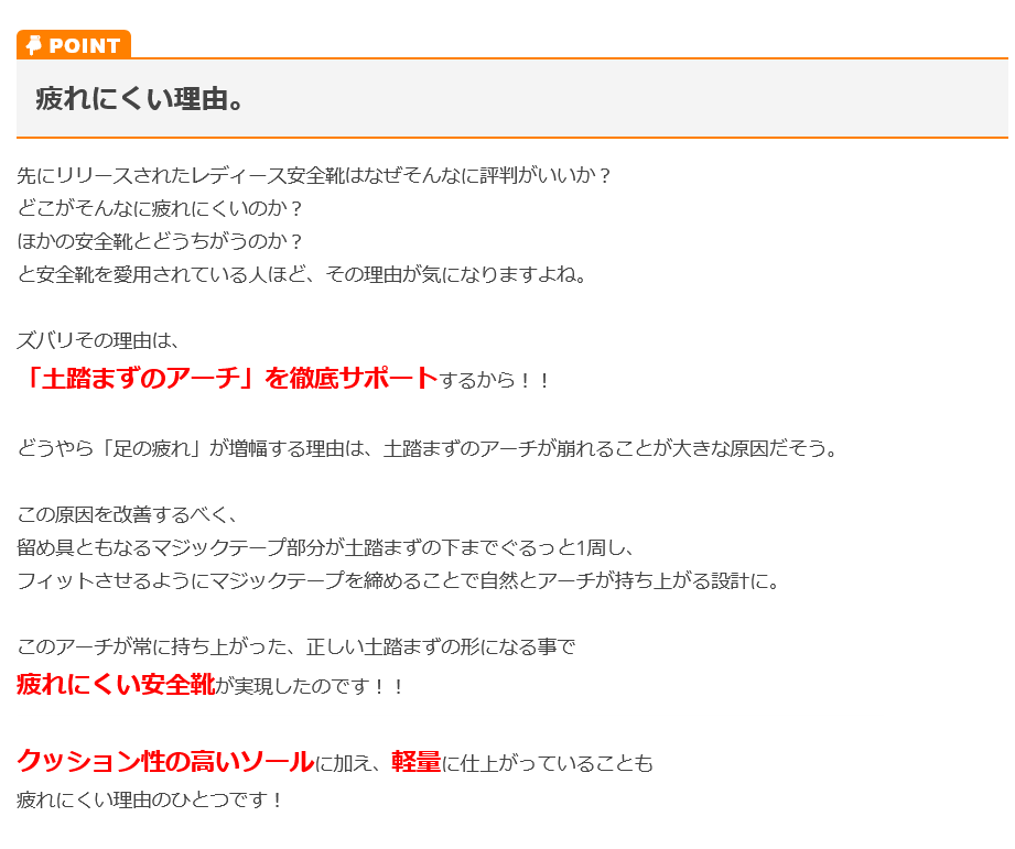 | 【特徴】 | 疲れた足を刺激せよ! 疲労感を軽減させるアーチサポート安全靴! レディース安全靴で大人気のFLY-UPからメンズモデルが登場! ◆長時間履いても疲れにくい!疲れの原因は「アーチ崩れ」にあり! 安全靴を長時間履いていて疲れるのは土踏まずのアーチが崩れるから。 このFLY-UPはマジックテープ部分が土踏まず下までぐるっと1周しているからマジックテープを締めると自然とアーチが持ち上がる設計になっています! アーチを持ち上げることで足の疲労を軽減させ、さらに足が靴の中でブレるのを防ぐのでアクティブに動けます! ◆ぱっと脱ぎ履きできる! 特徴的なかかとの形状はベルトを締めたままでも手を使わずに脱ぎ履きできるようにしています! ◆運転時のペダル動作も快適に! かかとの部分のソールを軽く巻き上げ下いるので快適なペダル動作ができます! ◆抜群のクッション性と安定性を実現したミッドソール! ◆しゃがみやすい!屈曲しやすい構造に! |