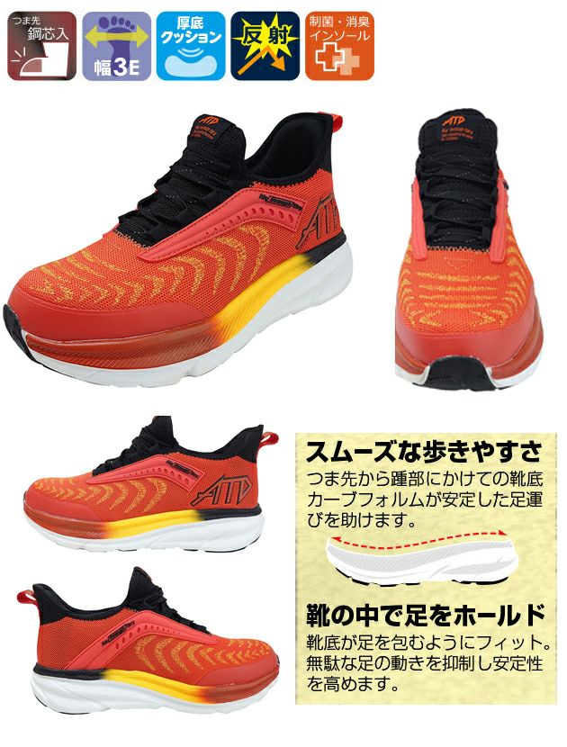 | 【特徴】 | 快適な履き心地で最高のパフォーマンスを! ◆長時間履いても疲れにくいクッション性! 厚底クッション設計なので衝撃を緩和してくれます! 長時間履いても疲れにくい安全靴です! ◆スムーズな歩きやすさ! つま先からかかと部にかけて靴底がカーブしているので安定した足運びを実現! つまずきを軽減し、歩きやすい! ◆無駄な足の動きを抑制し、靴の中で足をホールド! ◆履き口に厚めのクッションを搭載し、より履き心地アップ! ◆制金・消臭インソール搭載でニオイも軽減! |