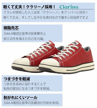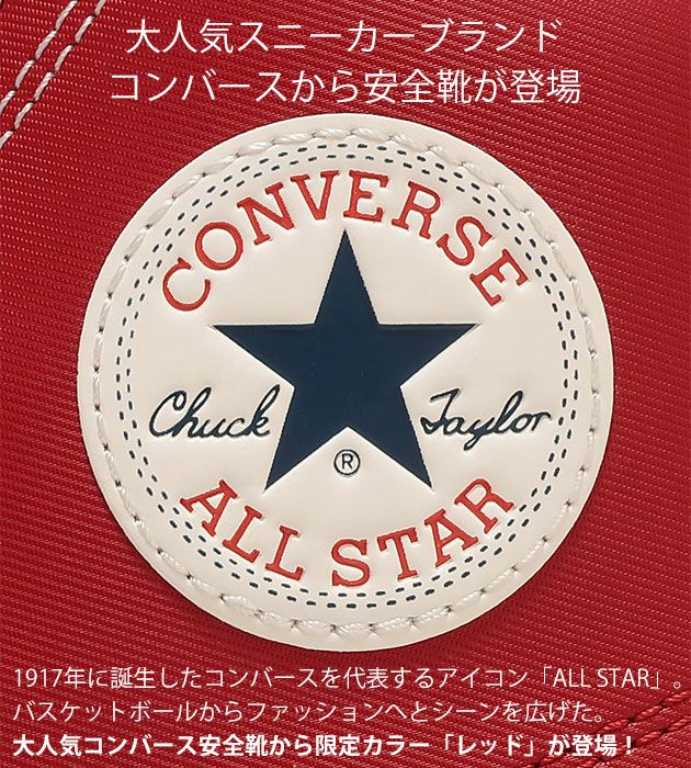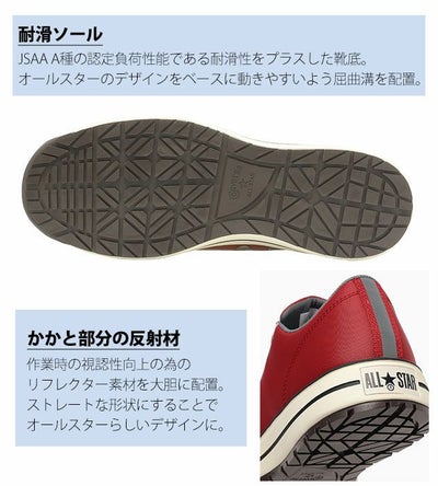 | 【特徴】 | 大人気コンバース安全靴! 足元が映えるレッドは数量限定モデル! 売切れたら二度と手に入らない限定カラーです! 更なるスペックアップデートを遂げたローカットモデル! ヒールラベルやラインの入ったミッドソールなど、よりオールスターらしいデザインに。 カジュアルな見た目と抜群な履き心地を両立したハイスペック安全靴! ◆軽くて丈夫な人工皮革「クラリーノ」を採用! ◆クッション性のあるミッドソールと中敷きで疲れにくい! ◆つま先を少し高めに上げる設計をしているのでつまづきにくい! ◆靴の中は抗菌防臭加工を施しているのでニオイを軽減! ◆ソールは耐滑性を備え、動きやすさと安全性を確保 ◆ベロ部分は作業時のムレを逃がすメッシュ素材を採用!さらに網目状の通気孔を設け、ムレを軽減! ◆かかと部分に反射材を採用!オールスターらしいデザインを生かしながら視認性も確保 |