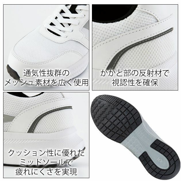 | 【特徴】 | 軽くてクッション性抜群! 軽量設計でクッション性に優れたEVAミッドソールが足への負担を軽減する安全靴! ◆通気性抜群のメッシュ素材を広く採用し、ムレを軽減! ◆かかと部の反射材で夜間・暗所での視認性も抜群 ◆クッション性に優れたミッドソールで長時間履いても疲れにくい ◆抗菌・防臭中敷き |