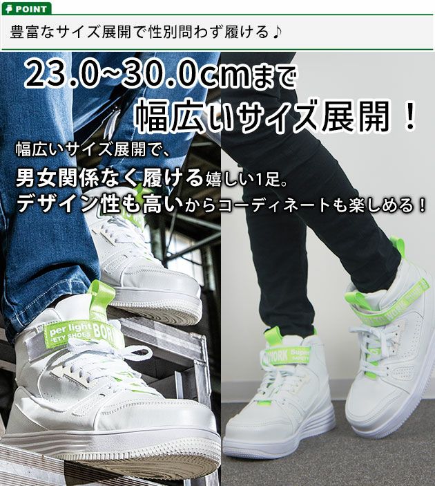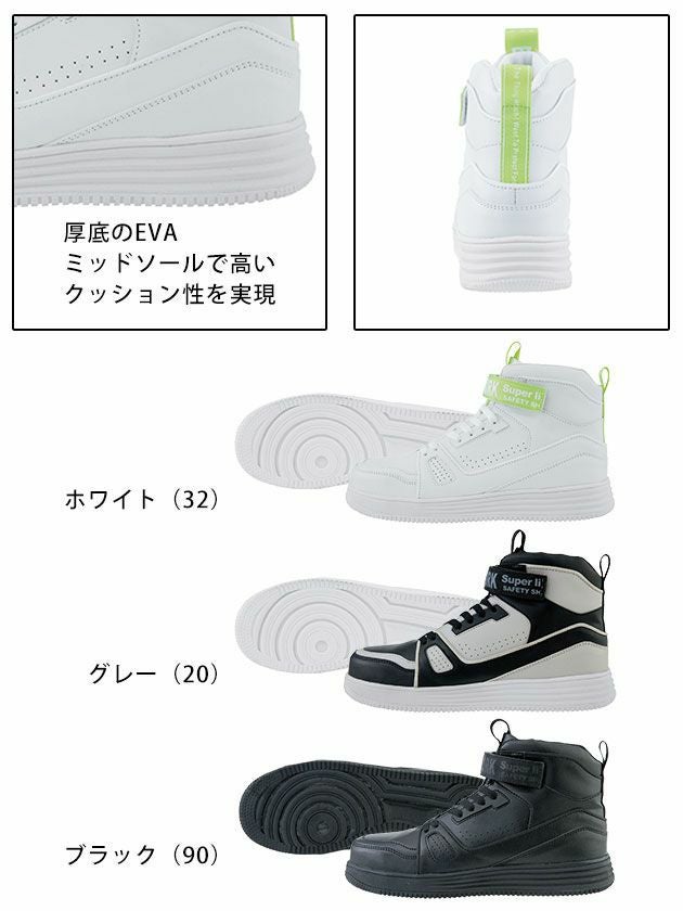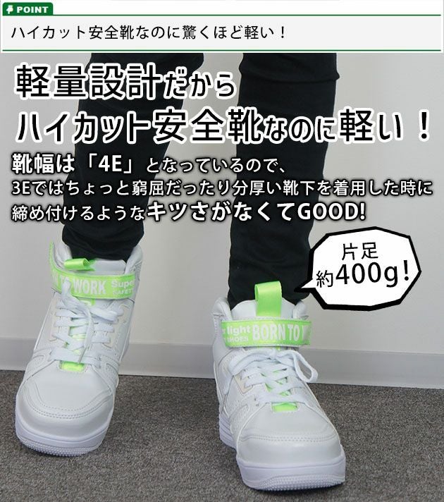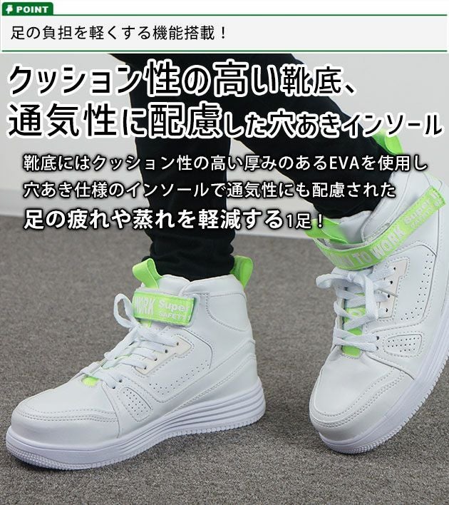 | 特徴 | ハードな見た目ながら軽量タイプで抜群の履き心地。 カジュアルワークに相性抜群なハイカットモデル。 クッション性の高い厚底タイプのEVAミッドソールで高いクッション性を実現。 ◆ハードな現場で活躍するオール合皮のセーフティシューズ ◆ハイカット仕様で作業中のくるぶしや足首をガード ◆ミッドソールには厚めのEVAを使用しているので優れたクッション性とともに軽量化も実現 ◆厚手手通気性のある穴あきインソールを使用、通気性も向上 ◆ウィズは幅広の4E設計でゆったりとした履き心地 |