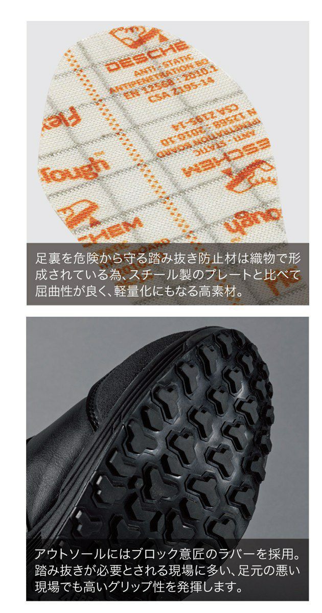 | 特徴 | 踏み抜き防止素材搭載で解体現場やゴミ処理場等の足元が危険な現場で活躍 釘やガラス片等から足裏を保護する踏み抜き防止材入りのミッドカットタイプ。 解体現場やゴミ処理場、災害用等にも幅広く使用できます。 またマジックテープ仕様なのでレースアップ仕様に比べて手袋等を着用していても手軽に締め付けの調整が可能です。 ■足裏を危険から守る踏抜き防止剤は織物で形成されているため、スチール製と比べて屈曲性が良く軽量化を実現! ■ソールは足元の悪い現場でもグリップ力を発揮するブロック意匠 ■かかと部分には反射材を使用し視認性を高めます! ■抗菌防臭中底 ■耐油ゴム底 |