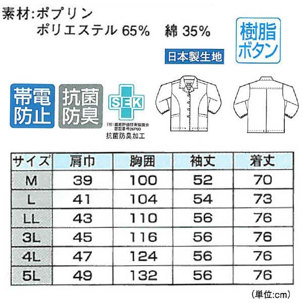 | 特徴 | 1、日本製生地 2、樹脂ボタン 3、抗菌防臭加工 4、帯電防止素材 |