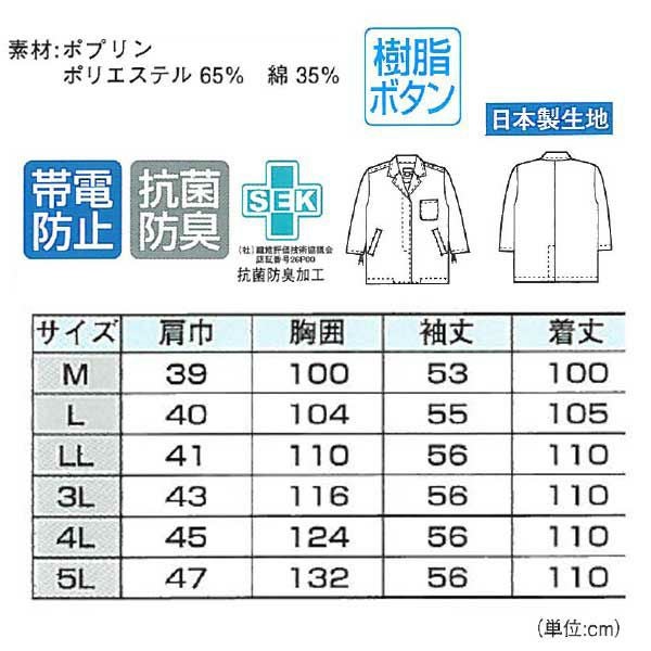 | 特徴 | 1、日本製生地 2、樹脂ボタン 3、抗菌防臭加工 4、帯電防止素材 5、袖口アジャスター |