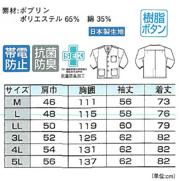 | 特徴 | 1、日本製生地 2、樹脂ボタン 3、抗菌防臭加工 4、帯電防止素材 |