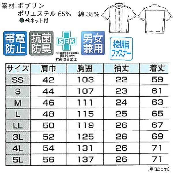 | 特徴 | 1、コイルファスナー 2、体毛落下防止袖 3、パイピング 4、日本製生地 5、樹脂ファスナー 6、袖ネット付 7、抗菌防臭加工 8、帯電防止素材 |