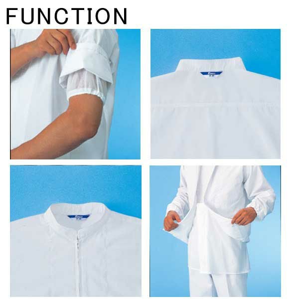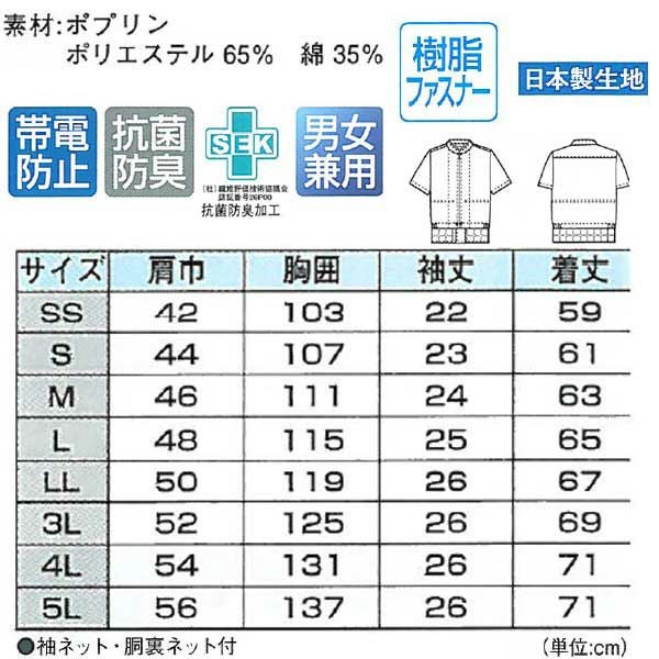 | 特徴 | 1、コイルファスナー 2、体毛落下防止袖 3、体毛落下防止胴裏ネット 4、パイピング 5、日本製生地 6、樹脂ファスナー 7、袖ネット・胴裏ネット付 8、抗菌防臭加工 9、帯電防止素材 |