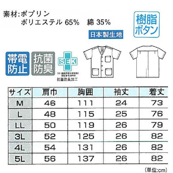 | 特徴 | 1、日本製生地 2、樹脂ボタン 3、抗菌防臭加工 4、帯電防止素材 |
