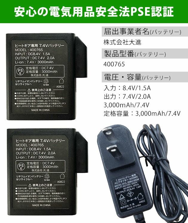 | 特徴 | 防水設計!専用ミニバッテリー2台付属 高機能素材カーボンナノチューブ採用 稼働時間:最大9時間稼働 温度均一性:均等に熱が広がり一定の暖かさを実現 耐水洗い性:断線の心配が無く、水に強いフィルムヒーター使用 【400765 ヒートウエア専用バッテリー7.4V専用】 大きさ:W68×D65×H18mm 重量:120g 大容量・高出力・コンパクトUSB出力ポート2か所 7.4V/3,000mAh 入力:DC8.4V 1.2A 出力:DC7.4V 2A 【400865 7.4Vバッテリー専用ACアダプター(二股)】 ケーブル長さ:840mm 重量:85g 充電時間:3.5時間(1台)7時間(2台同時) 入力:100~240VAC 50~60Hz 出力:DC8.4V ※400765バッテリー2台と400865 ACアダプター1台のセットです。 |