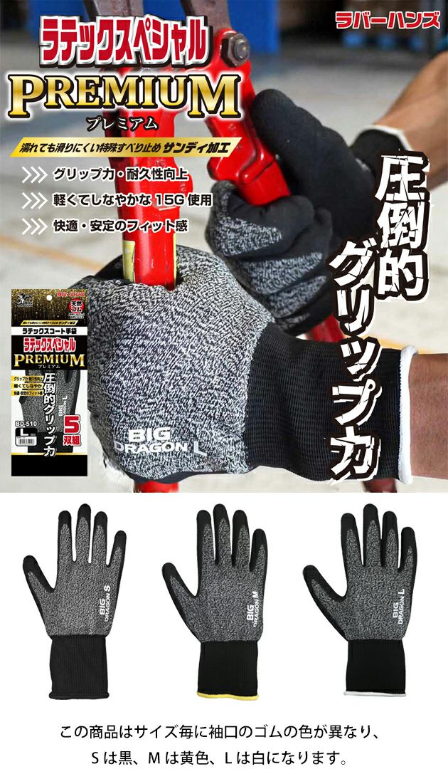 | 【特徴】 | 濡れても滑りにくい特殊すべり止め『サンディ加工』によりグリップ力・耐久性が向上。 軽くてしなやかな15ゲージなので手にフィットし指先作業もラクラク。 ◆圧倒的グリップ力 滑りにくい『サンディ加工』と天然ゴムのWコーティングでグリップ力・耐久性UP。 ソフト仕上げで疲労も軽減。 ◆背抜き加工でムレにくく、爽やかな使用感 天然ゴムコートだから低温でも柔らかさが持続。 運送・土木・建設・農業・漁業・水産に最適です。 ※袖口のカラーがサイズごとに異なり、Sは黒、Mは黄、Lは白になります。 |