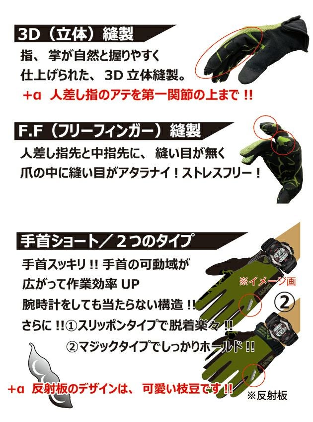 指に吸い付くようにフィットする指関節に沿った枝豆縫製と指・掌が自然に握りやすく仕上げた3D立体縫製。