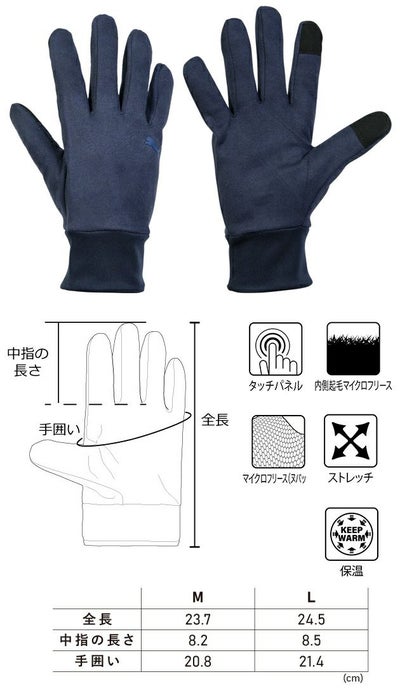 | 【特徴】 | ◆手袋をはめたままでもスマートフォンなどのタッチパネルの操作が可能。 手袋を着脱する煩わしさを解消。 ◆柔らかい手触りと程よい伸縮性のあるマイクロファイバーストレッチ生地を使用。 ヌバック風の生地は高級感があり、様々なシーンで着用できる。 ◆内側には手触りがよく、あたたかいマイクロフリースを使用。 保温性も高く、指先までしっかりあたたかい。 ◆手のひらを一枚の生地で仕上げ、指にマチをつけた立体縫製。 手指の動きを邪魔しづらく、手に馴染みやすい。 |