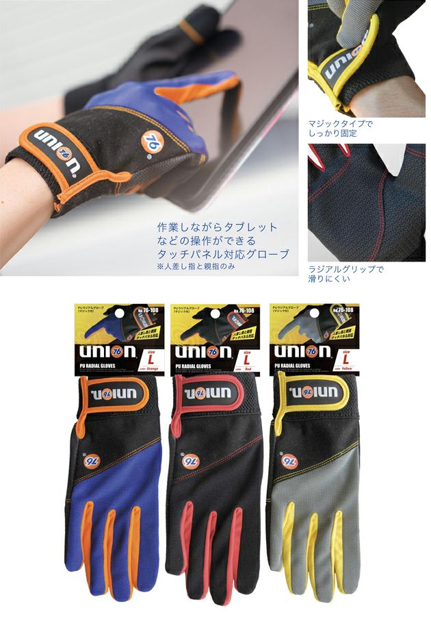 タッチパネル対応で作業しながらタブレットなどの操作が出来る UNION 76 手袋 PUラジアルグローブ 76-108