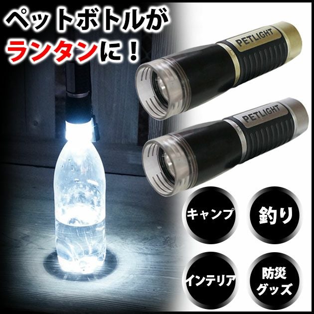 | 特徴 | キャンプ・釣り・インテリア・防災グッズにピッタリ! 身の回りのペットボトルがランタンに早変わり! ■120時間連続点灯 ※約30時間の強点灯後は徐々に暗くなります。 ■最大約20ルーメン白色高輝度LED搭載 ■ペットボトルにカンタン装着 市販のペットボトルにカンタン装着。 ※一部のペットボトルには使用できないことがあります。 ■ハンディライト切り替え 手持ち用LEDハンディライトとしても使用可能です。 ■軽防滴構造 急な雨でも安心。 防水ではございませんので、ご注意ください。 ■クイック点灯スイッチ 本体を軽く回して簡単点灯 |