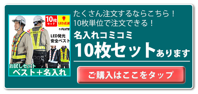 | 【特徴】 | LED電飾安全ベストに名入れをプラス! 団体名や企業名などお好みの文字を名入れできる名入れコミコミセットです! ◆電飾LEDを16個搭載! ◆電池別売り(単3乾電池2本) ◆左前に電池ボックス搭載 ◆軽くて丈夫なメッシュタイプ ◆テープ幅は60mm ◆脇部分のマジックテープでウエストを調節可能 ◆着脱カンタンなマジックテープタイプ |
