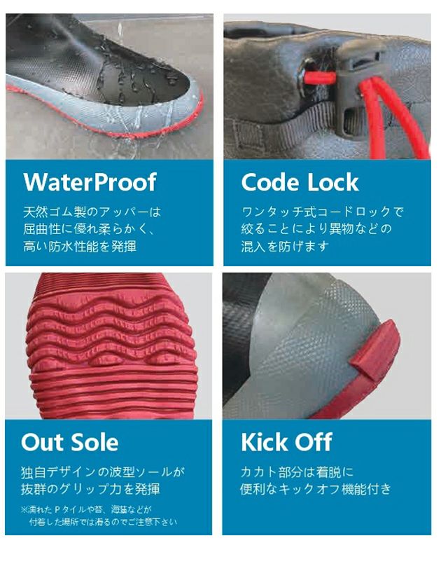 | 【特徴】 | ウォーターアクティビティーへGO! 高い防水性能を誇るおしゃれ長靴! ◆天然ゴム製のアッパーは屈曲性抜群! ◆フード部分はワンタッチ式コードロックでさっと絞れる! ◆ソールは独自デザインの波型ソールで抜群のグリップ力を発揮! ◆かかと部分は脱ぎ履きしやすいキックオフ機能付き |