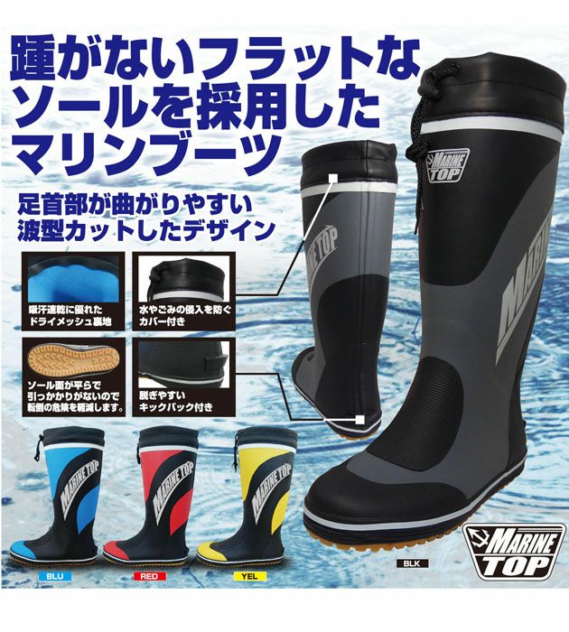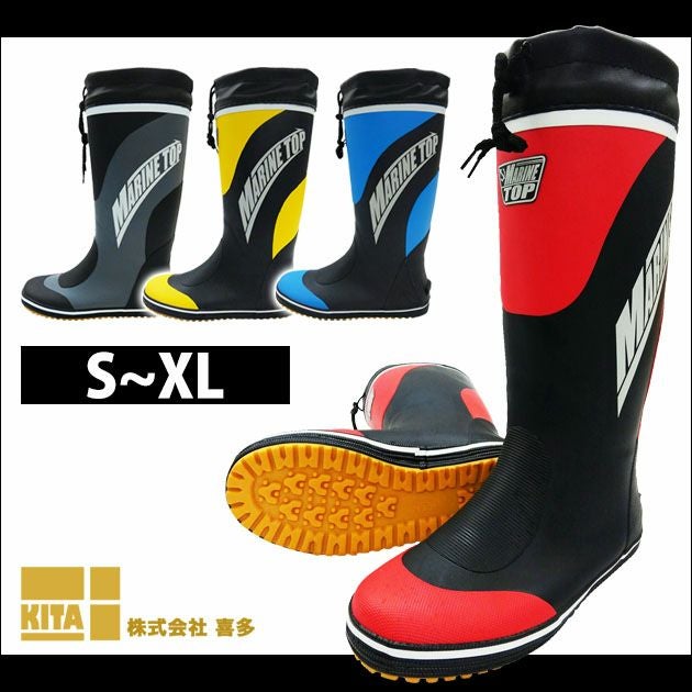 平らなソールで転倒の危険を軽減!足首波型カットで動きやすい! 喜多 長靴 マリンブーツ カバー付き KR-4100