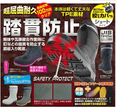 | 【特徴】 | ◆踏貫防止!解体や瓦礫撤去作業時に釘などの踏貫を防止する鋼板入り靴底。 ◆超屈曲耐久!屈曲試験100万回クリア ◆ほこり等が入りにくい絞れるカバー付きショートタイプ ◆JIS T8101の付加価値性能である1100N以上の踏貫試験をクリアしました。 ◆寒さに強い!!上耐冷温度マイナス約30℃ ◆側面のロゴにはエンボス加工、本体には迷彩シャドーエンボス加工 ◆制菌?消臭インソール標準装備 ◆脱ぎ履きしやすいキックバック付 |