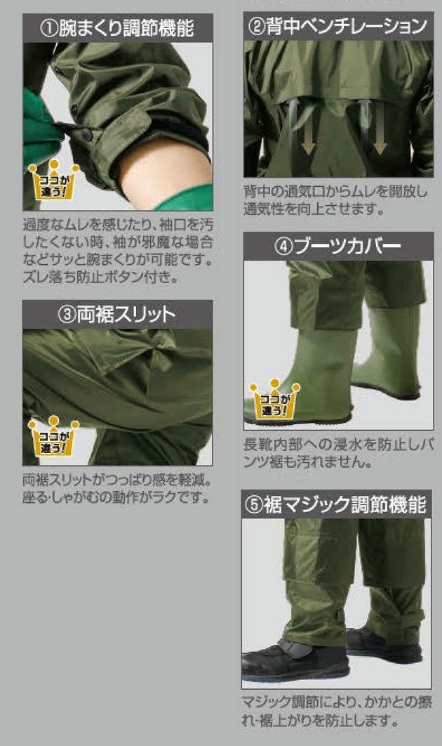 | 特徴 | 「不便を便利に」をテーマに開発! 着て実感!ブーツカバー&腕まくり調節 男女兼用のワーカーズモデル ■腕まくり調節機能 過度なムレを感じたり、袖口を汚したくない時、袖が邪魔な場合、などさっと腕まくりが可能 ズレ落ち防止ボタン付き ■背中ベンチレーション 背中の通気溝からムレを開放し通気性を向上させます。 ■両裾スリット 両裾スリットがつっぱり感を軽減 座る・しゃがむの動作がラクラク! ■ブーツカバー 長靴内部への浸水を防止しパンツ裾も汚れません ■裾マジック調節機能 マジック調節により、かかとのスレ、裾上がりを防止します ■ウエストゴム仕様 ■収納袋なし ■耐水圧:10,000mmH2O |