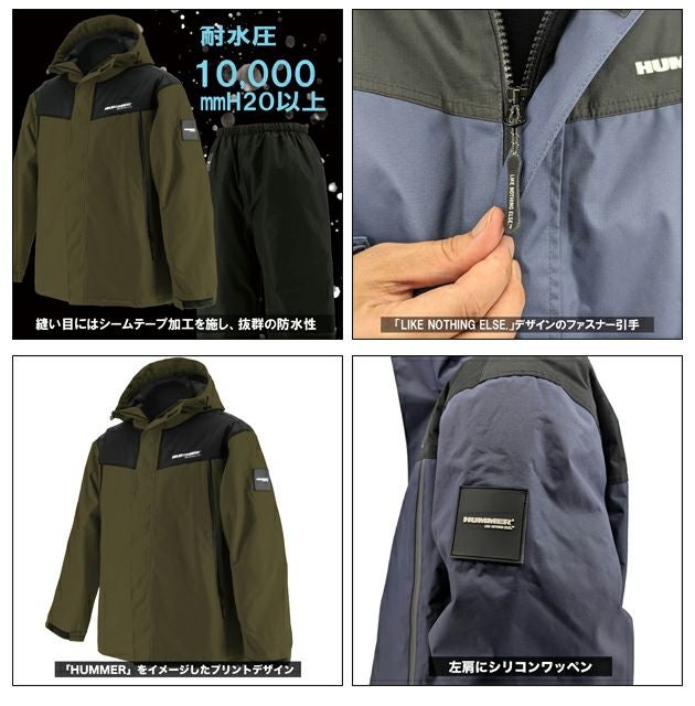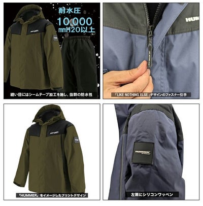 | 【特徴】 | SUVブランドの「HUMMER」をイメージした防水防寒レインレインスーツ。 どこまでも走破できるような、強靭で機動的な車体をモチーフにした唯一無二のデザイン。 【上着】 ・「HUMMER」をイメージしたプリントデザイン ・左肩に「HUMMER」ロゴのシリコンワッペン ・「HUMMER」ロゴ入りの裏地 ・「LIKE NOTHING ELSE.」デザインのファスナー引手 ・止水ファスナーポケット(右×1、左×1)(フリース裏) ・水の浸入を防ぐ袖口調節のフラップテープ ・左右首元にフード調節が可能なドローコード ・裾の左側に調節用のドローコードを装備 【パンツ※各色共通】 ・ウエストコード仕様 |